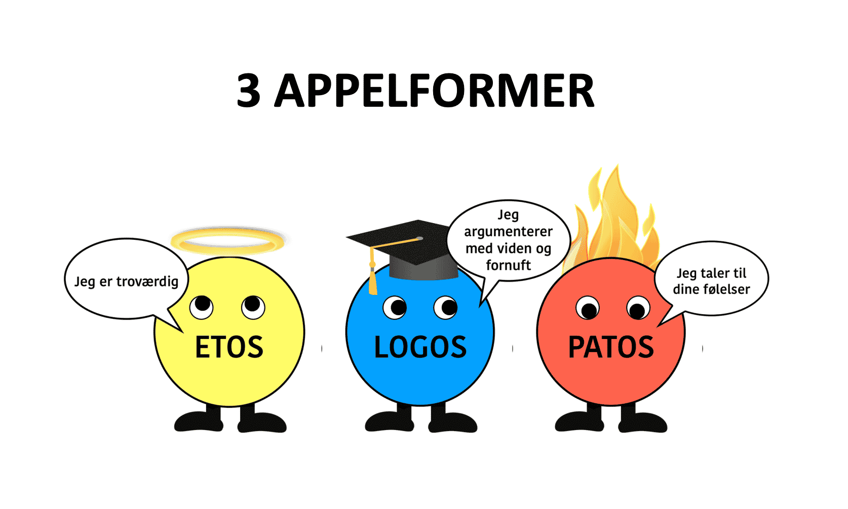 De 3 appelformer er 3 måder, man kan henvende sig til et andet menneske på. At appellere vil sige, at du rækker ud til den, der lytter til dig og prøver at få forståelse og accept for det, du siger. De 3 appelformer bruges især i opinionsartikler, hvor afsenderen har en holdning, og hvor det er vigtigt at virke troværdig overfor læseren.