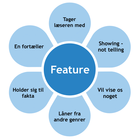 Låner fra andre genrer En feature “låner” ofte sprog og beskrivelser fra andre genrer. Fx kan man bruge sprog fra noveller, hvor der udspiller sig en slags handling. eller sansende sprog fra essay osv. for at gøre det mere spændende at læse.