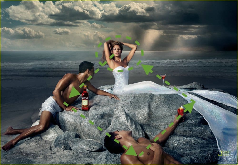 stopeffekten. Det sted, hvor dine øjne hviler. Herefter fører usynlige linjer os videre rundt i billedet. Det kan fx være en persons blik, der er rettet mod en anden person, der så kigger ned på produktet eller ud på dig. Det kan også være en arm, et ben, en kjole der peger mod noget bestemt.