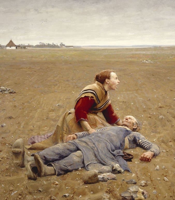 Det behøver ikke at ligne et foto, men det er situationen på billedet, som viser det realistiske. Her er det fx en mand, som er faldet om efter langt og hårdt arbejde i marken.