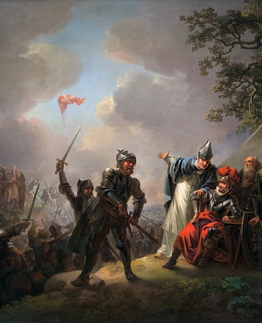 “Dannebrog falder ned fra himlen under Volmerslaget ved Lyndanise 15. juni 1219”, Christian August Lorentzen (1809)