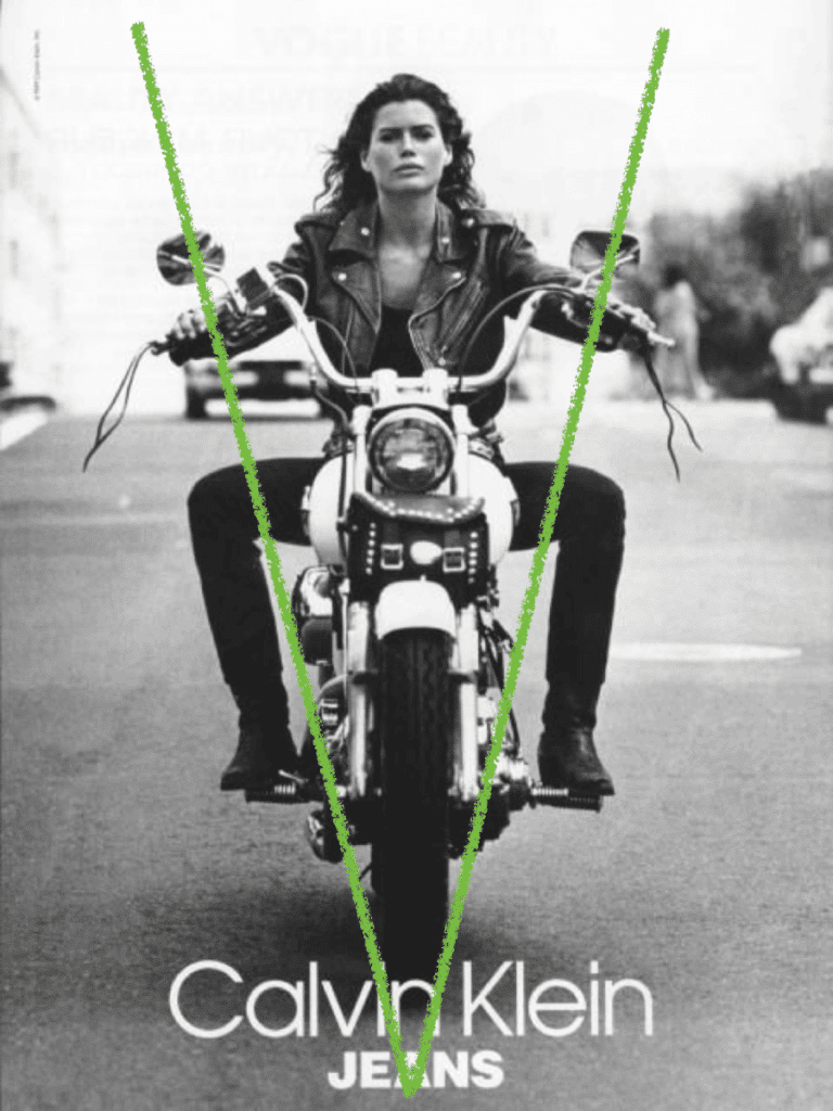 En trekants-komposition, hvor spidsen vender nedad, signalerer disharmoni / ustabilitet. Der er moment af fare og uro – vælter hun på den motorcykel?